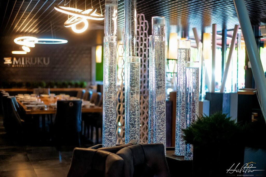 Атмосфера ресторана создана в результате длительных бесед с дизайнерами, специалистами по Японскому стилю в интерьере и теми кто лично посещал эту страну. Строгие, темные оттенки с переменчивыми неяркими цветами создают спокойствие и уют. А тихая, спокойная мелодия сямисэна, что льется из колонок, напоминает журчание горного ручья, производя релаксирующий эффект. Доброжелательные, улыбчивые официанты и менеджеры на стойке бронирования, вежливо сопроводят Вас к столику и позаботятся о том, чтобы время пролетело незаметно и чтобы Вы смогли расслабиться, испробовав на себе колорит островной страны, через ощущения и вкус изысканных блюд ресторана «MIRUKU».